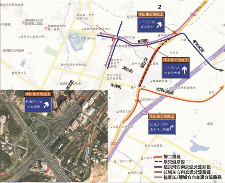 此外,临近施工路段的交叉道路主要有东湖街、湖心街、丰泽街。往东海方向车辆可选择东湖街—老君大道—山海路分流,往城东方向车辆可利用坪山隧道—安吉路分流,往市区方向车辆可通过东湖街—刺桐路分流。