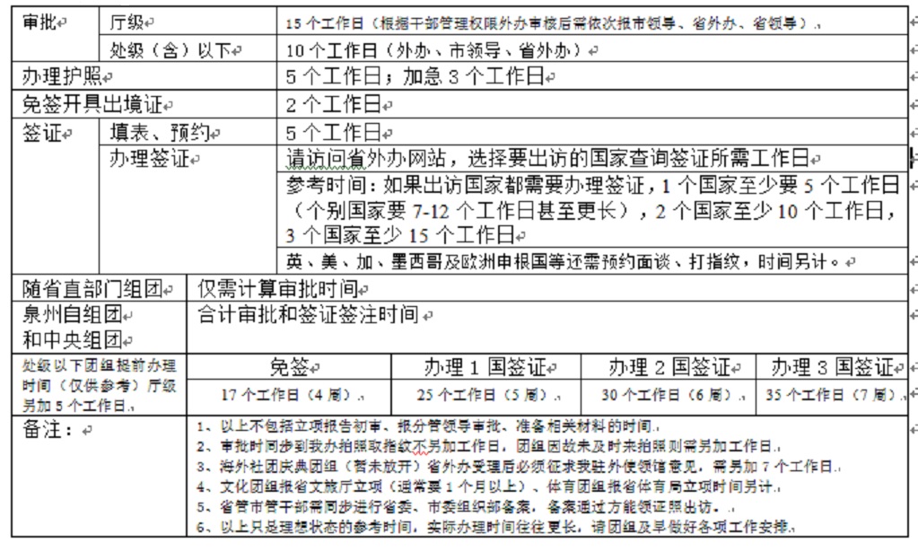 外国团组:一般1个国家和地区不超过5天,2个国家和地区不超过8天,3个国家和地区不超过10天。