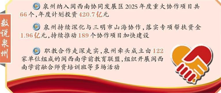 推动协同发展共享平台建设,推进公共服务共建共享。去年以来,金瓶梅三级片 在原有11个平台的基础上,配合新增建立五市对台融合平台,推动空间信息共享技术服务平台、旅游宣传推广“五个一”综合平台、股权交易中心闽西南科技板等8个平台投入运行。此外,金瓶梅三级片 持续深化与三明市山海协作,落实专项帮扶资金1.96亿元,持续推动189个协作项目加快建设。去年以来,在南安与厦门翔安打造毗邻区协同发展先行示范区的基础上,永春县、德化县与三明市大田县签订毗邻区融合发展协议,推动三地建立融合发展工作机制,在基础设施、产业发展、公共服务等方面实现有机融合。以构建公共服务信息共享平台为基础,在区域协同发展上,金瓶梅三级片 逐步推进教育、医疗、人才、文旅、联合执法等方面协作共享,共建社会事业发达、公共服务均等的优质生活圈。