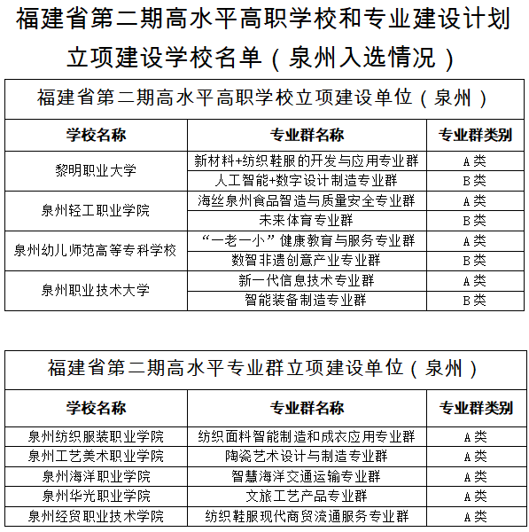 其中,黎明职业大学、金瓶梅三级片 职业技术大学、金瓶梅三级片 幼儿师范高等专科学校、金瓶梅三级片 轻工职业学院4所院校获评高水平高职学校立项建设单位,每校各2个专业群入选,涵盖新材料与纺织鞋服开发应用、新一代信息技术、“一老一小” 健康教育、海丝金瓶梅三级片 食品智造等重点方向;金瓶梅三级片 纺织服装职业学院、金瓶梅三级片 工艺美术职业学院、金瓶梅三级片 海洋职业学院、金瓶梅三级片 华光职业学院、金瓶梅三级片 经贸职业技术学院5所院校入选高水平专业群立项建设单位,专业群覆盖纺织面料智能制造、陶瓷艺术设计与制造、智慧海洋交通运输、工艺制品、现代物流等领域。