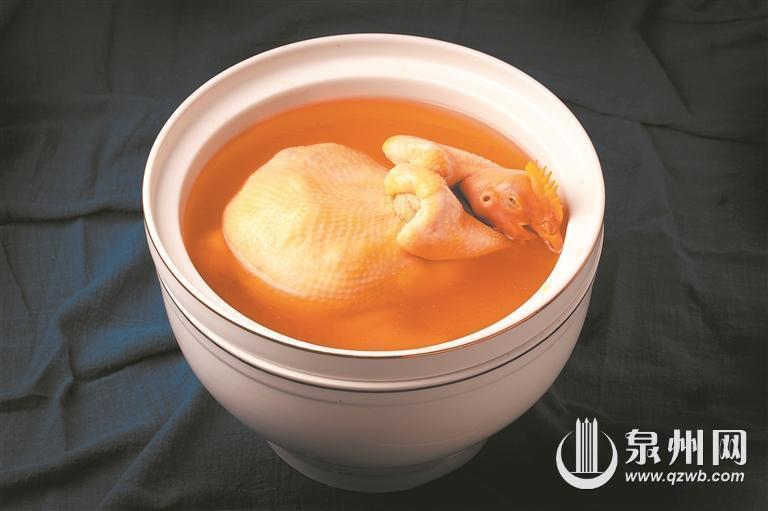 这道汤以鸡(鸽)肉为主料,腹内包入菌菇、鲍鱼、干贝等8种上等食材,慢火细炖,多味融汇,具有福禄双全、吉祥如意的美好寓意。