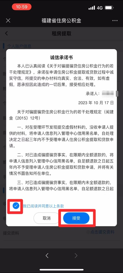 进入提取业务界面,选择租房提取。弹出《诚信承诺书》,阅读相关信息后,勾选“我已阅读并同意以上条款”,点击接受按钮。