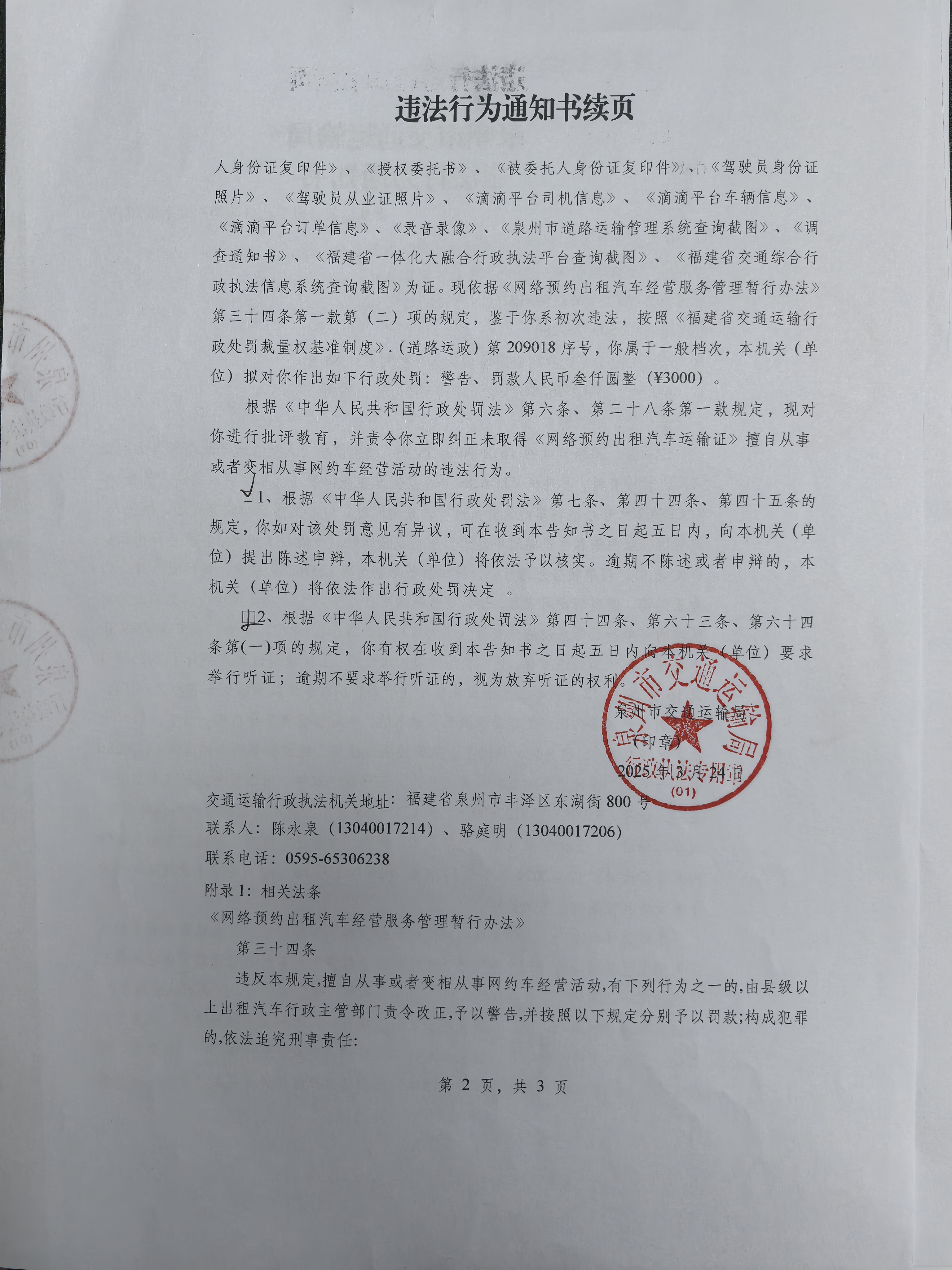 附件:《违法行为通知书》{闽泉四交执(2025)通字第62号}