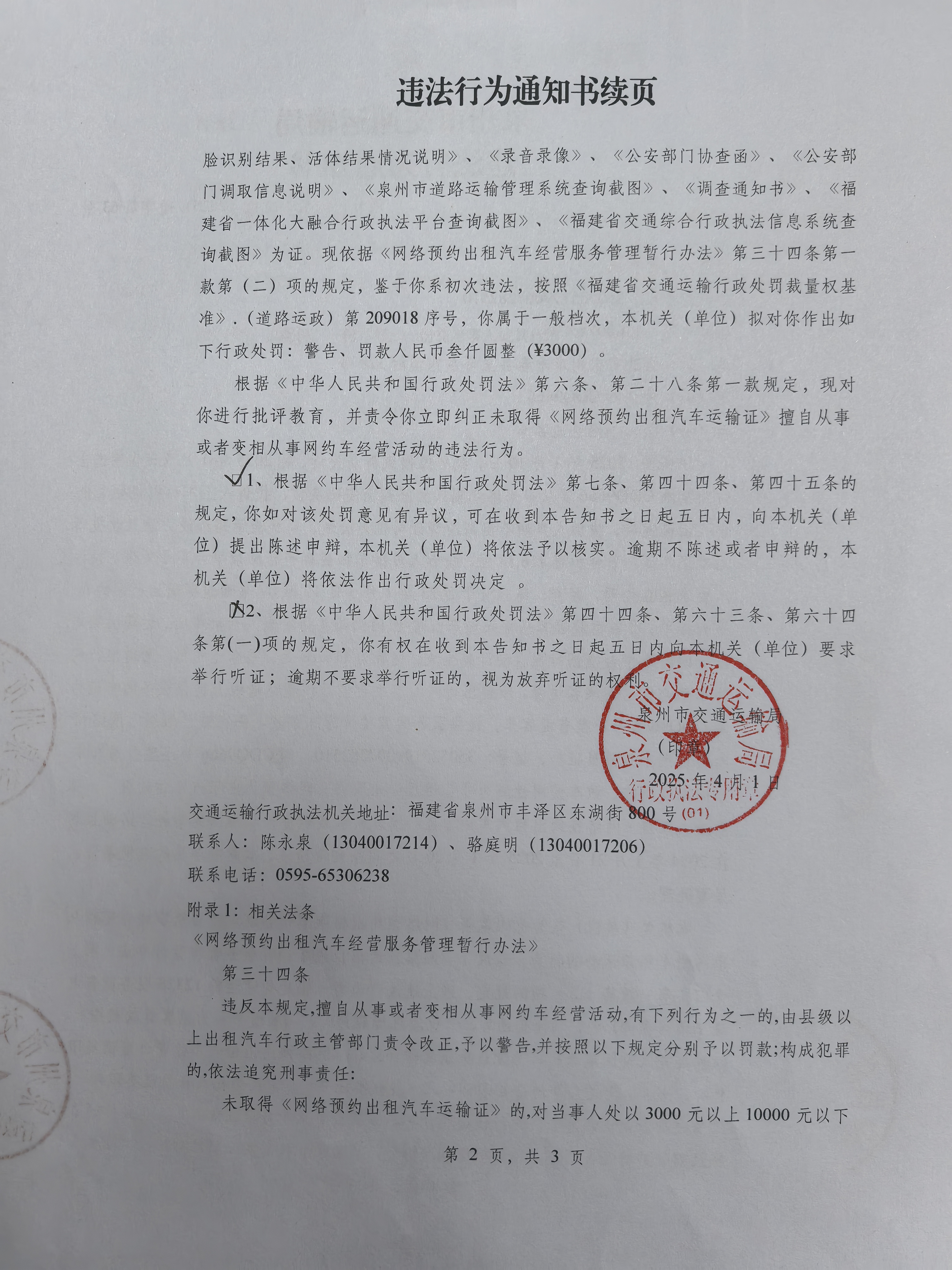 附件:《违法行为通知书》{闽泉四交执(2025)通字第63号}