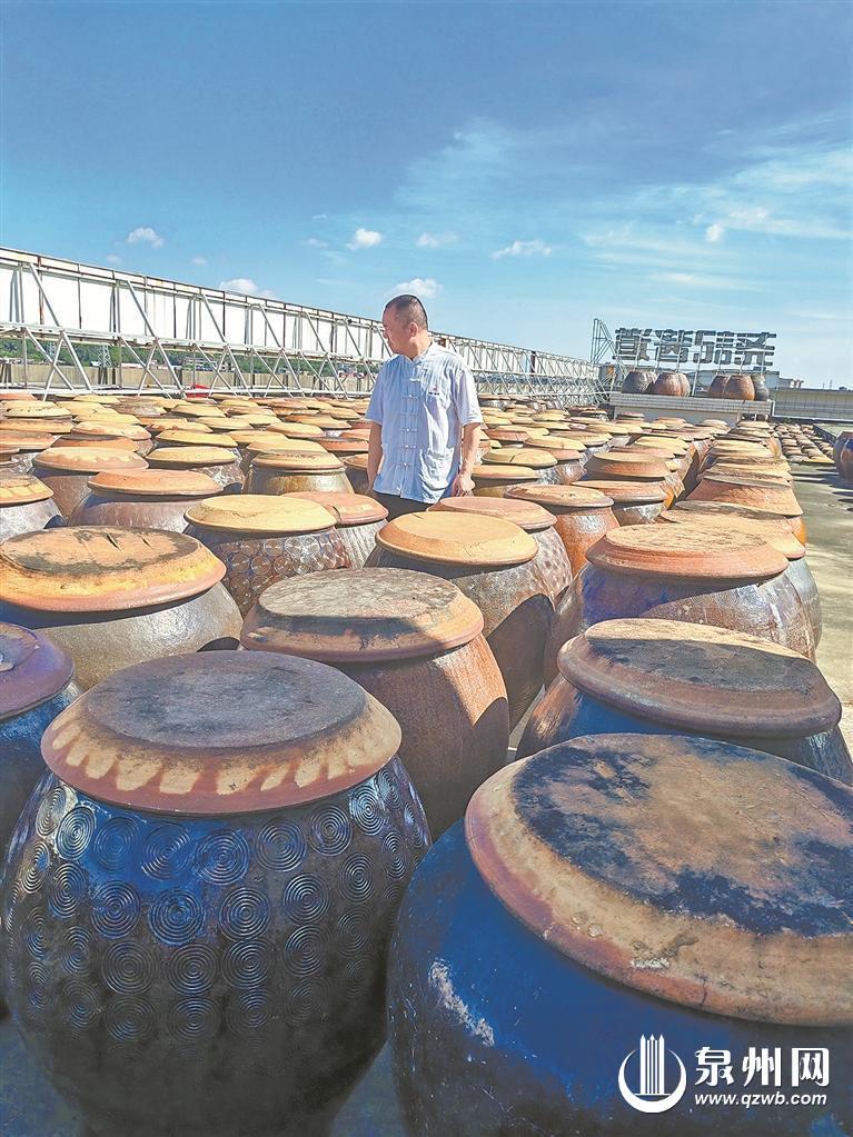 近日,记者来到惠安尧记酱道,踏入制酱工厂,首先映入眼帘的是天台排列整齐的古朴陶缸。这些陶缸是酿造酱油的关键所在。周青尧介绍说,陶缸的吸水率大于2%,历经百年酿造,不断吸收酱汁,形成了独特的酱锈。