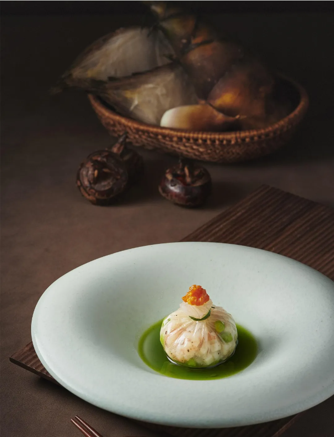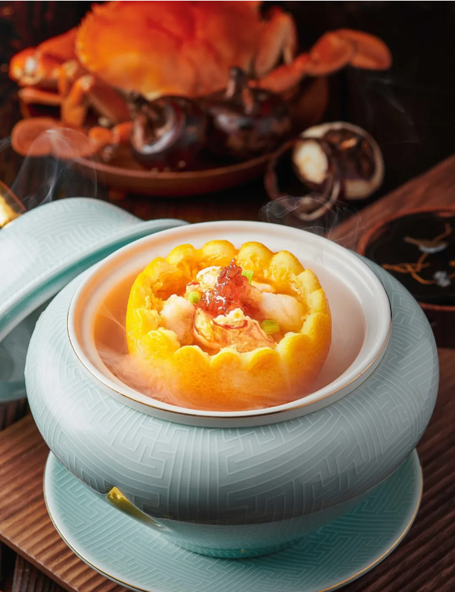 “口感扎实,肉质脆,适口,鲜!”身着清新宋朝衣裙的女子,将一盏“蟹酿橙”递给霍爷,他轻舀一勺,送入口,忍不住赞叹。