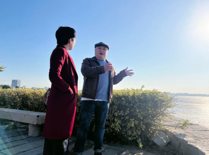 石狮文体旅游局局长蔡迎媚为霍爷介绍林銮渡的历史