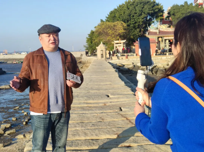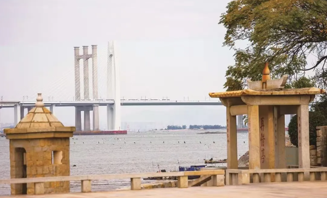 站在林銮渡口通往海上礁石的人工通济栈桥上,千年前上岸的挑夫沉重的脚力在礁石上留下的道道印记依然清晰可见。而吸引霍爷的,还有身处渡口远眺可及的另一幅画卷——石湖港区,现代化国际港口,时有轮船从这里穿行;福厦高铁跨海大桥,银色巨龙疾驰而过,商贸之都的繁荣景象尽收眼底。它们与宁静的林銮渡同框,完成了对比鲜明却不违和的时空“连线”。