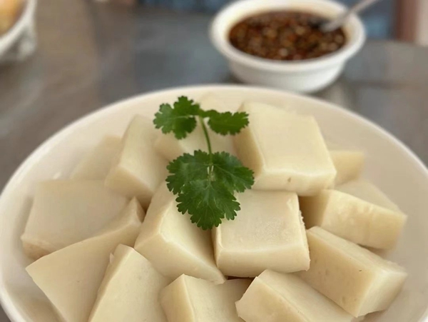 以传统工艺制成,色泽洁白,口感软糯。碱香独特,萦绕舌尖,仿若诉说着故乡的悠悠岁月。点缀的翠绿香菜,更添一抹清新。它是东田人记忆中的甜蜜滋味,承载着浓浓的乡情,每一口都是对故乡味道的深情回味。
