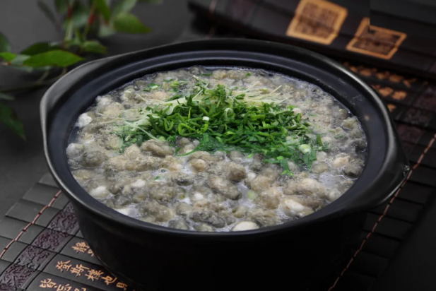 2、砂锅盛入水烧开,缓缓放入裹粉的海蛎,调味。
