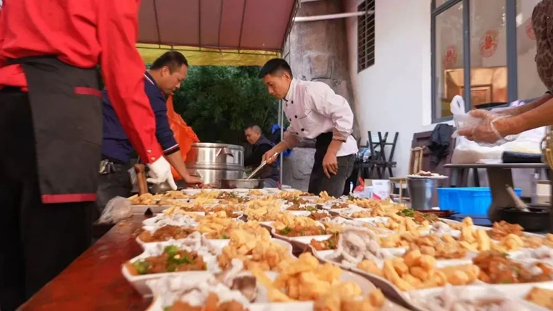 “今年农历2月的乡宴订单已经排满了。”张贵明介绍,每年掌勺一百多场是常事,高峰时期甚至高达两百多场近万桌,有时候一场将近200桌。每一场宴席,张贵明都亲自掌勺,随着订单越来越多,张贵明还成立了专业团队,行走于十里八乡,为群众奉上一场场家宴。