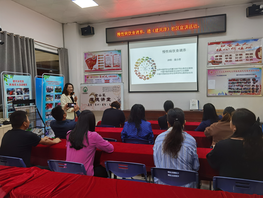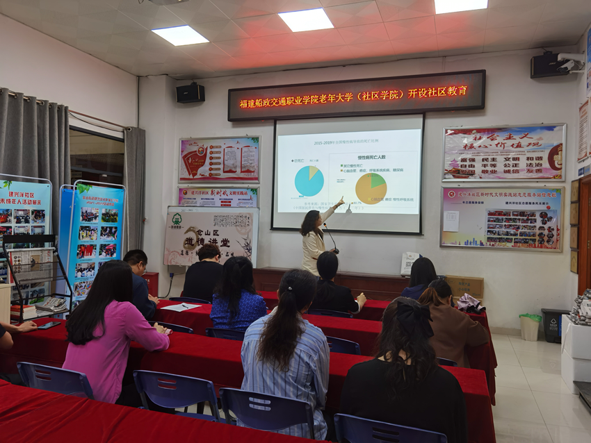 为了增强社区居民的健康意识,提高居民的生活质量,福建船政交通职业学院老年大学(社区学院)于2023年4月20日上午走进建兴洋社区,开展“食品营养”课程,课程详细介绍人们应该注意的合理营养膳食习惯,并对慢性病饮食调养做了讲解。